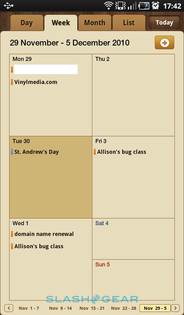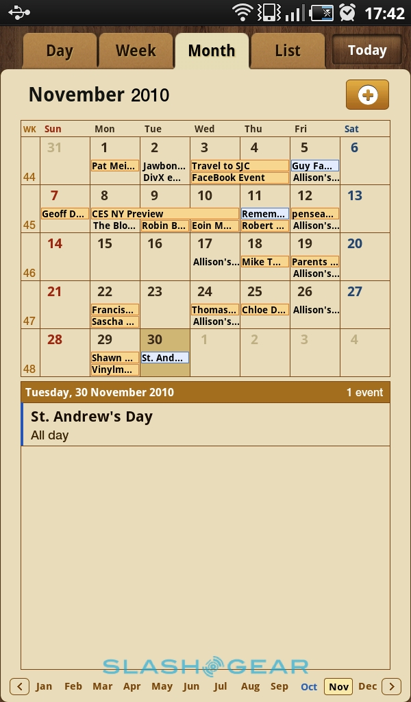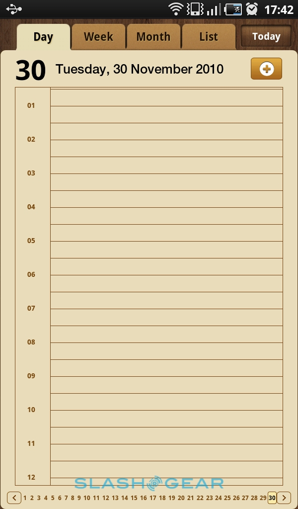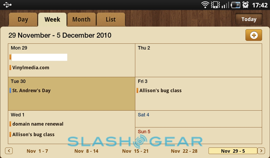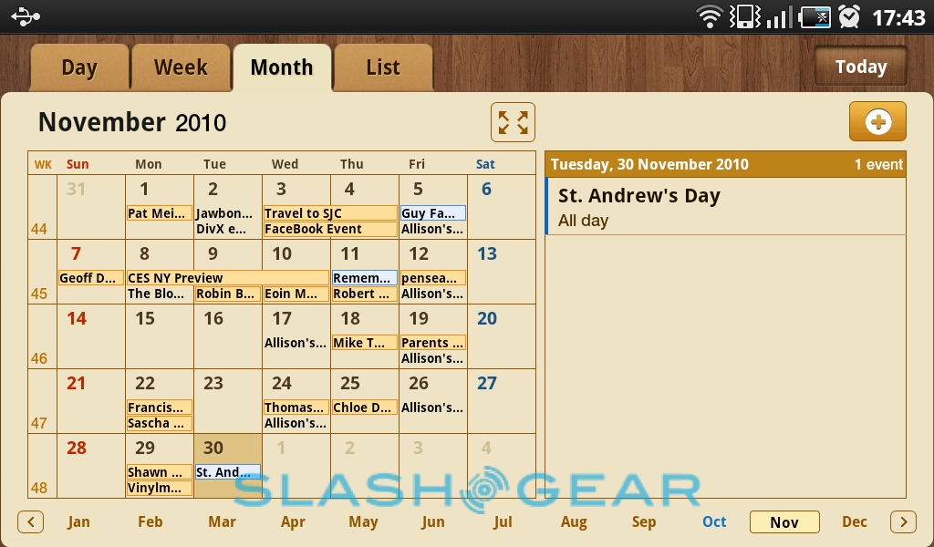 Finally, the calendar app, which looks much like a Filofax. Again, both portrait and landscape orientations are supported, with day, week, month and list views. The Galaxy Tab automatically pulled in our Facebook and multiple Google Calendar schedules, color coding them accordingly, with Facebook invites also showing a thumbnail of the user's profile picture. Again, it's considerably better than the regular Android calendar, and makes great use of the screen space on offer.