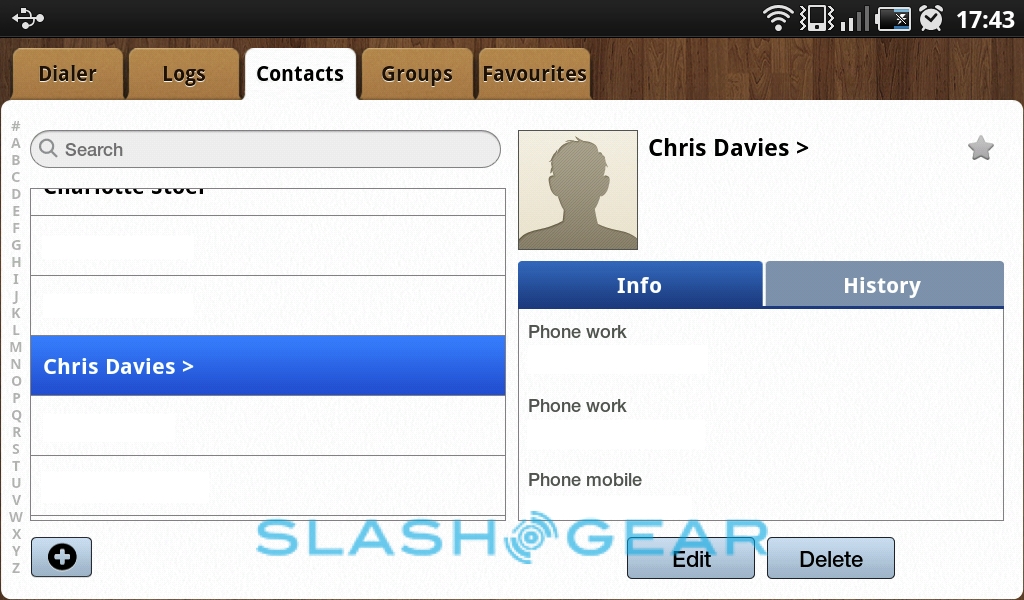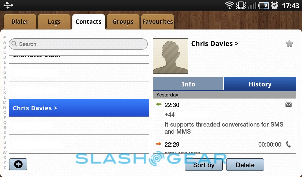 Samsung's three key custom apps are their email client, the calendar and the address book. The latter splits the screen in two, with an alphabetical list of contacts on the left and a preview pane on the right; there are two tabs in the preview, the first showing all that contact's details, the second a recent history of calls and messages sent and received. Facebook friends can be imported, and contacts can be grouped or individual favorites picked out.