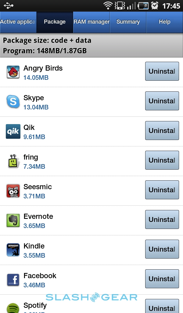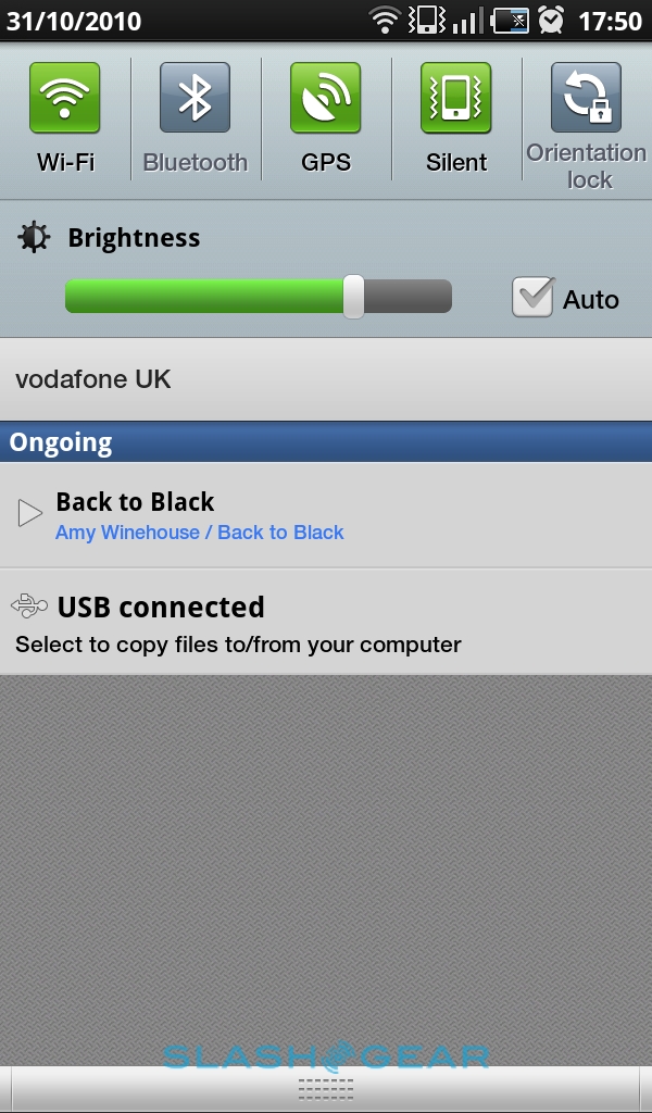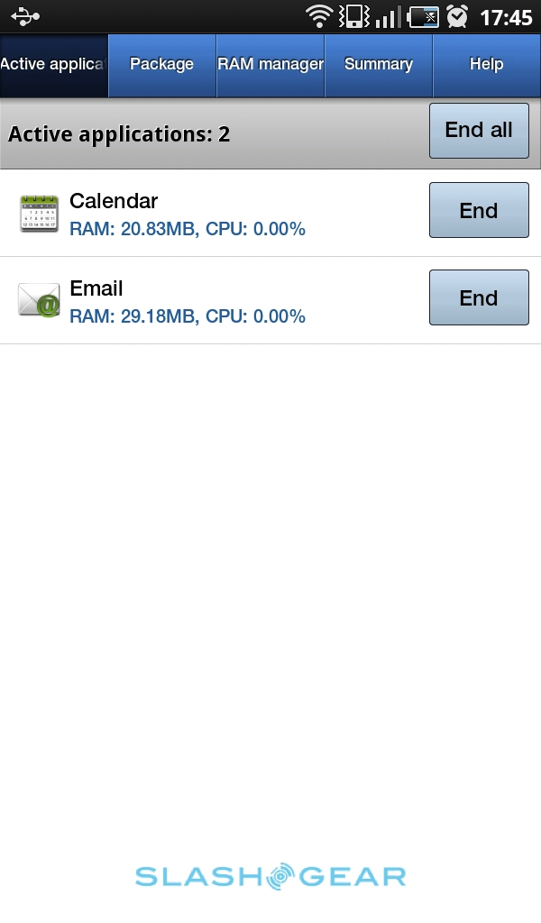 The number of currently active apps is shown, together with a colored bar to indicate memory status; tapping the widget opens a custom Task Manager, from which individual apps can be force-closed or uninstalled. There are also RAM and storage meters, offering a quick insight into what's monopolizing system resources. You can also access the Task Manager from anywhere in the system by holding down the Home button, bringing up an app-switcher that also shows the eight most-recent programs. As well as the brightness control in the pull-down notification bar, there are buttons to control WiFi, Bluetooth, GPS, put the Tab into silent mode, and lock the screen orientation.