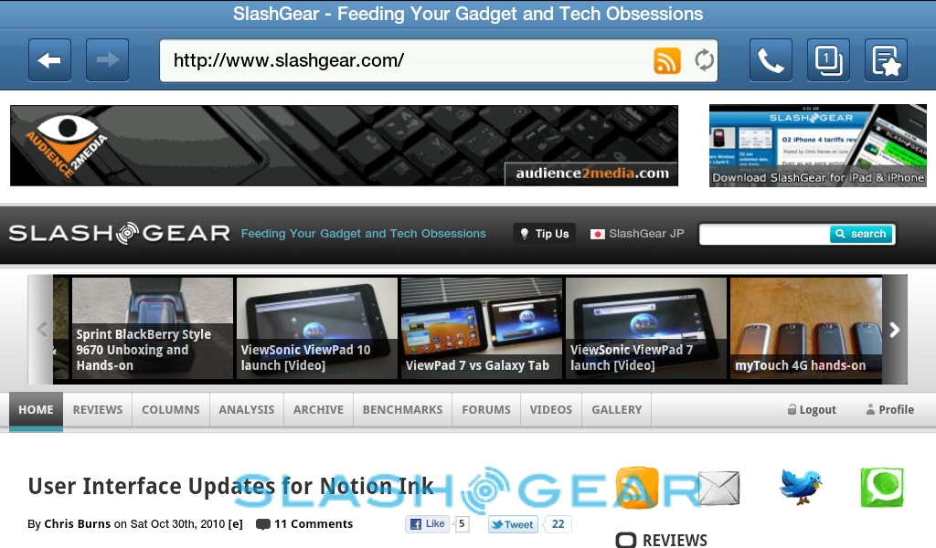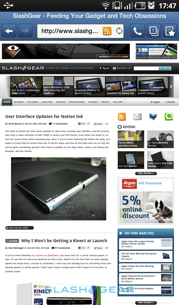 Our main complaint about the browser is the absence of User Agent ID control, which leaves many sites defaulting to their mobile version rather than the desktop site which the Tab is quite capable of handling. Usually, though, there's an option to switch to the full version on a per-site basis; another alternative is to use the third-party Dolphin browser, available through the Android Market.