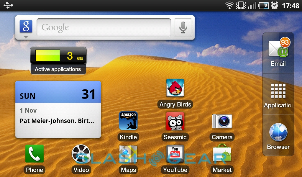 The display is a 7-inch panel running at 1024 x 600 resolution, higher than any Android smartphone on the market and besting several other similarly-scaled Android tablets which have generally stuck to WVGA. It's not one of Samsung's Super AMOLED screens, sadly, but it's still almost indecently bright at its maximum setting and the viewing angles are broad. The capacitive touchscreen, meanwhile, is responsive, as are the four backlit touch-sensitive buttons running underneath the display: menu, home, back and search.