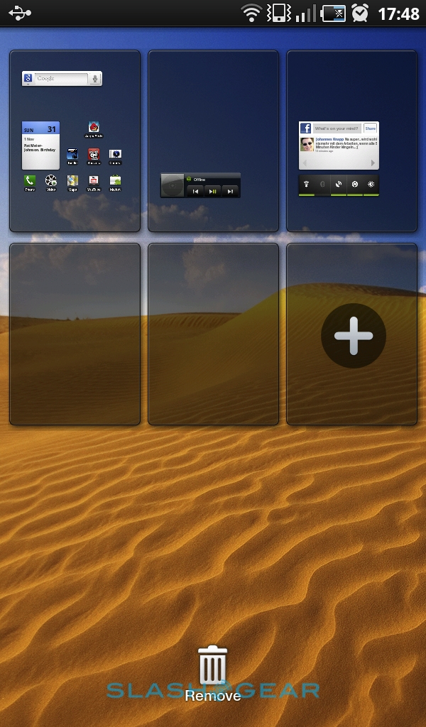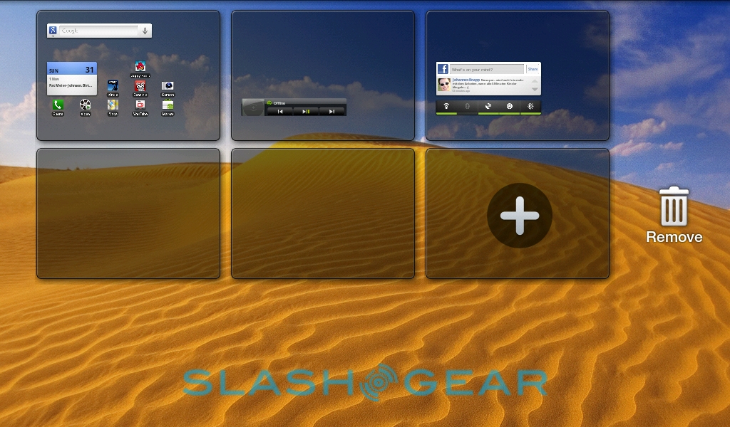 The homescreen and main menu are TouchWiz 3.0 inspired, with a default five desktop panes (you can have a maximum of nine) which can be filled with widgets and moved between with a finger-swipe (since there's no D-pad or optical joystick). A pinch-zoom gesture shows thumbnails of all screens for speedier navigation. At the bottom of each pane is a three-button shortcut bar, with two user-definable shortcuts (browser and email, by default) and the Applications button in the middle. Unlike on Android phones, each pane supports a 5 x 5 grid of icons and widgets (4 x 4 is the norm); as well as the usual widgets, shortcuts and folders, Samsung has added a few new clocks (including examples with weather or calendar integrated), social updates with the Feeds and Updates widget, and – most usefully – a Program Manager widget.