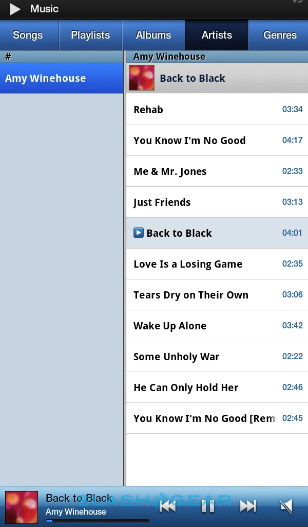 Samsung's excellent LCD panel comes into its own with multimedia playback, and while it lacks the superlative blacks and zinging colors of a Super AMOLED screen, it's still among the better LCDs we've used. The company has modified the standard music and video apps, again to suit the larger screen, and they're generally good.