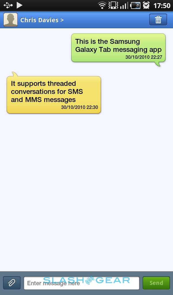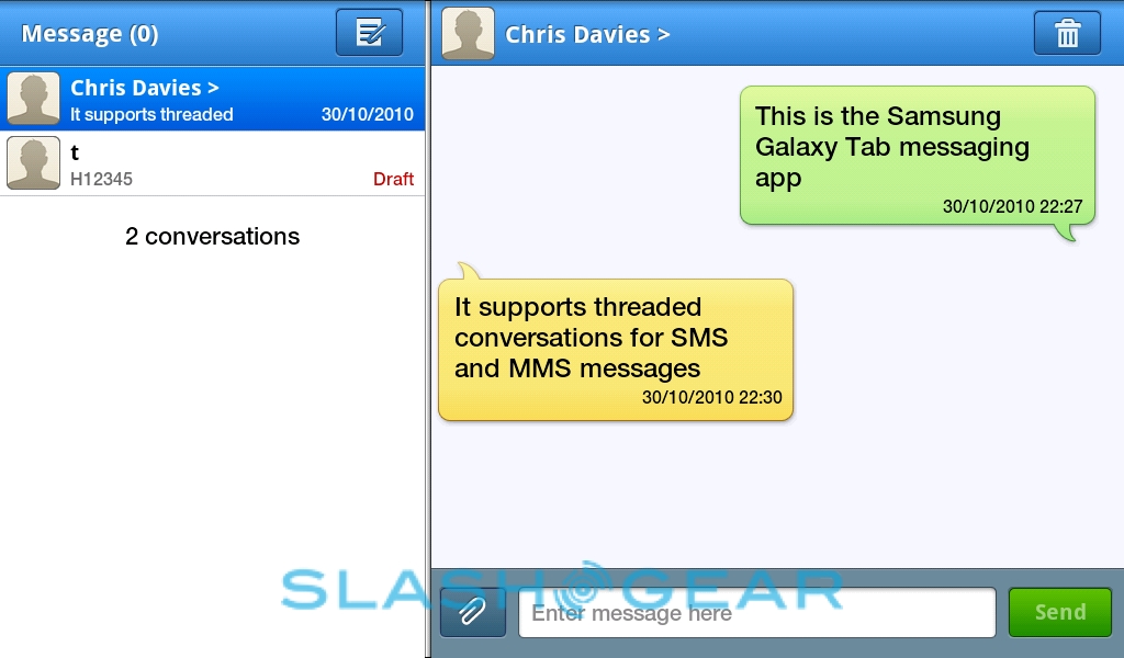 All versions of the Galaxy Tab support SMS/MMS messaging, though you may need a messaging plan to send and receive texts from the North American models. The messaging app itself has a speech-bubble interface for threaded conversations, including various font sizes for the messages themselves.