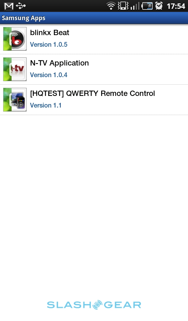 Samsung Apps is another carry-over from the company's smartphone line, though right now it's ridiculously sparse in its selection. In fact, there are a mere three apps on offer: a QWERTY touchscreen remote app, for use with Samsung's network-connected TVs, blinkx Beat for viewing online videos, and N-TV, which streams German news. Happily there's also Android Market access, more on which later.