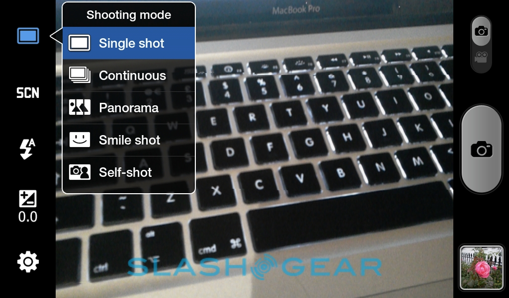 Samsung has given the Galaxy Tab two cameras, a primary 3-megapixel autofocus unit on the back, paired with an LED flash, and a 1.3-megapixel camera above the slate's display, intended for video calls. The camera app itself is pretty standard fare, with buttons for shooting mode, scenes, flash on/off/auto, exposure and settings running down the left side of the display, and a camera/camcorder mode toggle, shutter release button and gallery shortcut on the right side. Icons along the top of the display show image/video resolution, GPS status (if the optional geotagging is switched on), number of shots left, where they're being stored (to the Tab's internal memory or to microSD) and battery status.