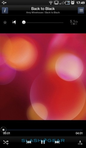 Playback buttons appear in the track browser when a track is selected, or you can stick with the regular now-playing screen that shows huge album art, control buttons, volume, optional track info, shuffle and repeat mode. Swiping across the screen skips tracks. There are various equaliser modes and sound enhancements, but no option to automatically download missing album art. If you leave the music app during playback, a shortcut is automatically added to the drop-down notification menu (complete with the name of the currently playing track).