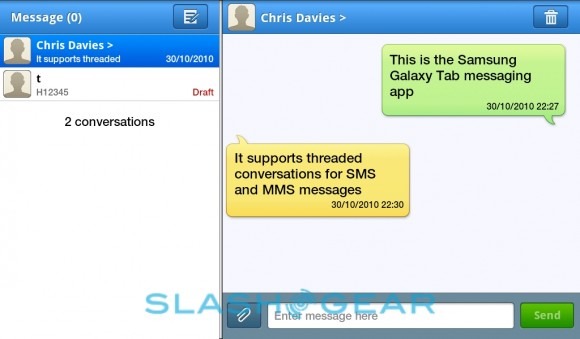 All versions of the Galaxy Tab support SMS/MMS messaging, though you may need a messaging plan to send and receive texts from the North American models. The messaging app itself has a speech-bubble interface for threaded conversations, including various font sizes for the messages themselves.
