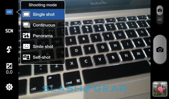 For photography, five shooting modes are on offer (single, continuous, panorama, smile shot and self-shot, the latter flipping to the front-facing camera) and five scene modes (portrait, landscape, night, sports and off). From the settings menu it's possible to change white balance (auto, daylight, cloudy, incandescent and fluorescent), effects (normal, negative, black & white and sepia), ISO (auto, 100, 200 and 400) and image quality (normal, fine and superfine). The main camera can shoot up to 2048 x 1536 stills.