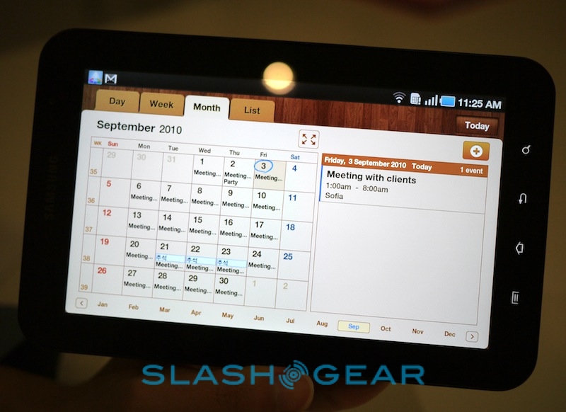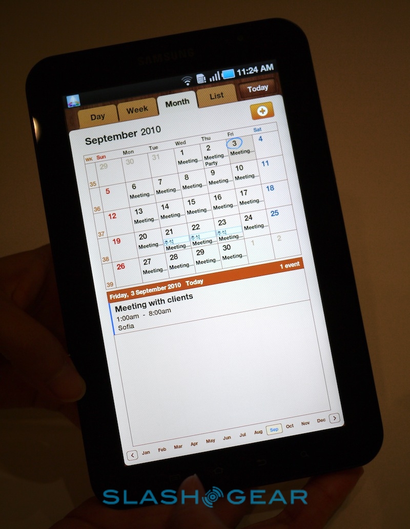 Samsung is also working closely with Google on Android development, with regular "high level meetings" and plenty of shared code. That bodes well for how much work they – and indeed other tablet manufacturers – may have to do to finesse Android for larger-screen devices, reducing the amount of customisation and thus helping cut down on OS upgrade delays. The company couldn't say, though, whether developers would have access to their own particular customized apps on the Galaxy Tab, such as the new calendar app, but they will be able to easily produce their own software suited to the 1024 x 600 display.
