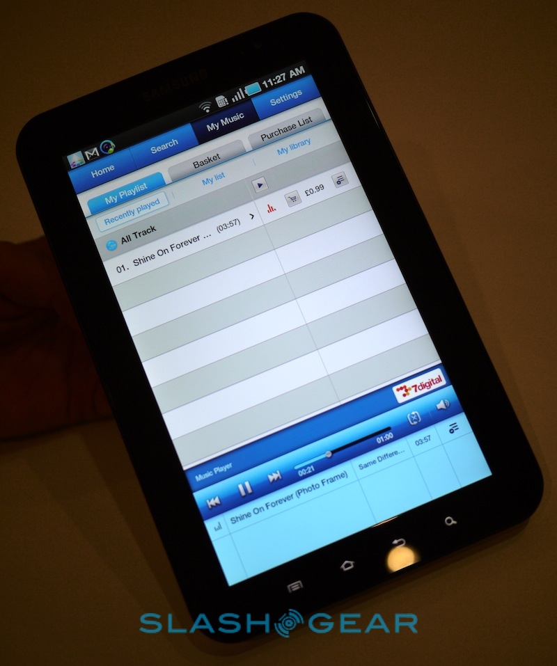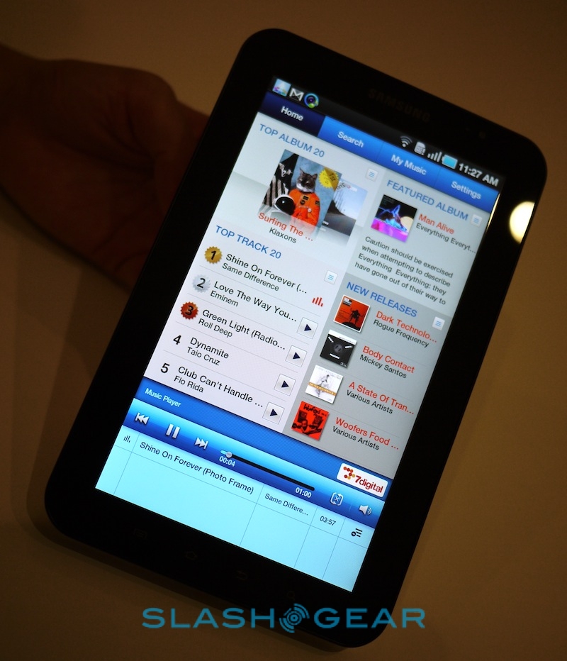 For multimedia, meanwhile, Samsung has partnered with 7digital to offer on-device DRM-free audio files. That can obviously be mixed with side-loaded content. 7digital doesn't offer video, but you can view content via Samsung's AllShare streamed over wireless connections. Thanks to the HDMI dock you can output 1080p Full HD video to your HDTV, complete with 5.1-channel surround sound, and there's also Samsung's free "QWERTY Remote Control" app for operating their IP-connected TVs.