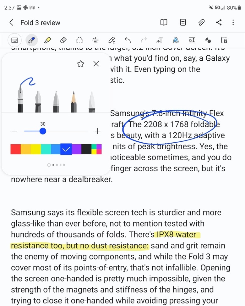 Samsung sells the S Pen separately, from $50, and certainly you don't need it in order to use the Fold 3 comprehensively. With the Wacom-powered, battery-free stylus, though, you can do handwriting recognition, annotate and scribble on PDFs and other files, and use the foldable as a mini graphics tablet.