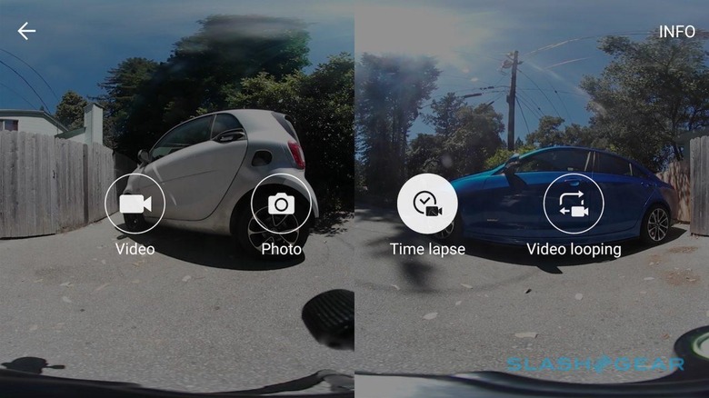 There are four core modes on offer. Still images and video are the two obvious ones, but Samsung also includes time-lapse – snapping a 360-degree still at a set interval from 0.5s to 60s, then stitching them all together into a single video – and video loop. The latter can be set at various intervals from 5 minutes up to the maximum capacity of your microSD card, and basically stores the most recent footage from that period.