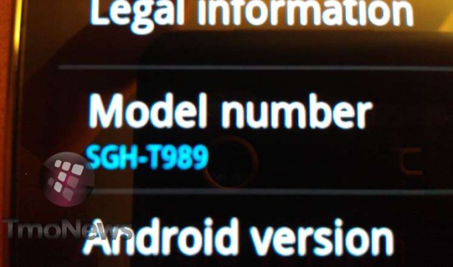 There's of course a camera on the front as well, and if these photos are indeed correct, will be rocking the TeleNav GPS app out of the box and will have model number SGH-T989. Three of these photos come from TmoNews, the front, the back, and the model number, and the TeleNav image comes from PocketNow. The PocketNow image(s) look to be slightly less expanded near the bottom of the display, but this could just be the camera angle at which they've all been photographed.