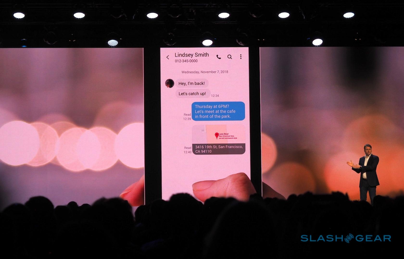 Justin Denison, SVP of Mobile Product Marketing for Samsung Mobile, showed the device to developers at the Samsung Developer Conference this week. The device he had in his pocket was covered with a box. A boxy sort of casing for the phone that disguised the design elements – everything save the displays. From the displays, we got a whole lot of information.