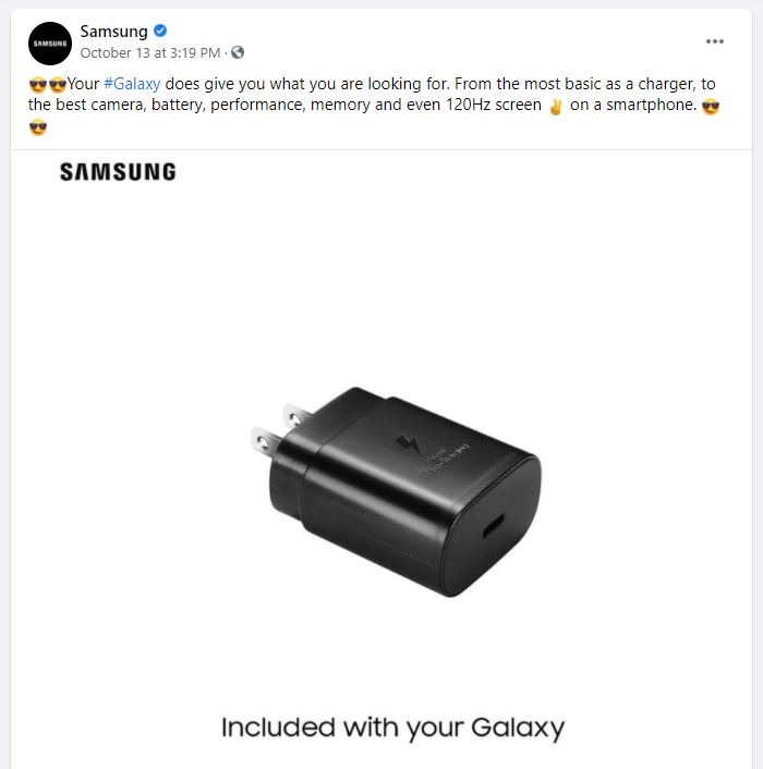 In a Facebook post, Samsung shared an image of its USB-C charging block and noted that it is included with the latest and greatest Galaxy smartphones like the Note 10. The company doesn't mention Apple or the iPhone in its post at all, but it's clear what prompted the post.