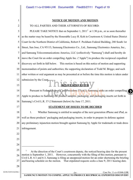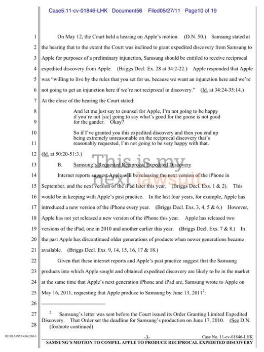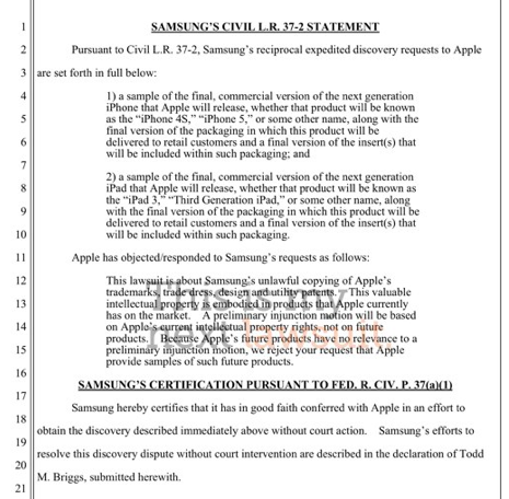 What does this mean? I wont go into too massive a torrent of analysis here, but basically it means there isn't going to be an inch of advancement allowed on either side of the line drawn in the sand. Samsung notes that they want the "final, commercial versions" of the devices by June 13, 2011 OR, if these devices aren't available at that time, they'll accept "the most current version of each to be produced instead." Samsung doesn't appear to KNOW that Apple is producing new versions of the iPad or the iPhone, but everyone in the world "knows," if you know what I mean. They're acting off of "internet reports" and "Apple's past practice."