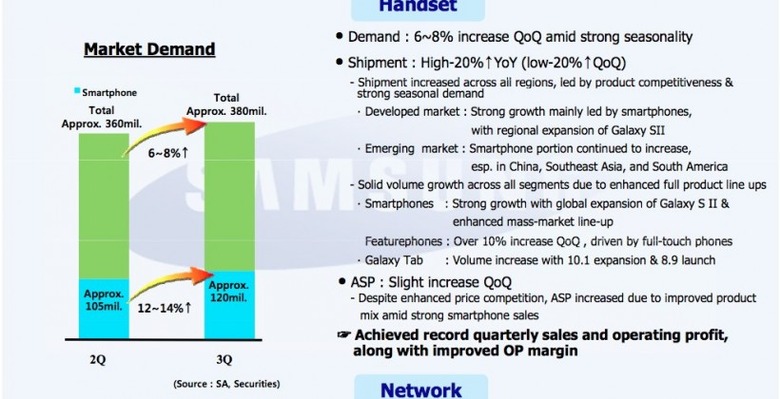 Samsung has announced its Q3 2011 financial performance, and while overall profit has taken a hit, the Korean company's smartphone sales have soared. Huge demand for the high-spec phones saw record quarterly sales and operating profit in Samsung's telecoms division, with Strategy Analytics estimating Samsung shipped 28m smartphones in the three month period and thus overtook Apple to take the number one spot in the segment.