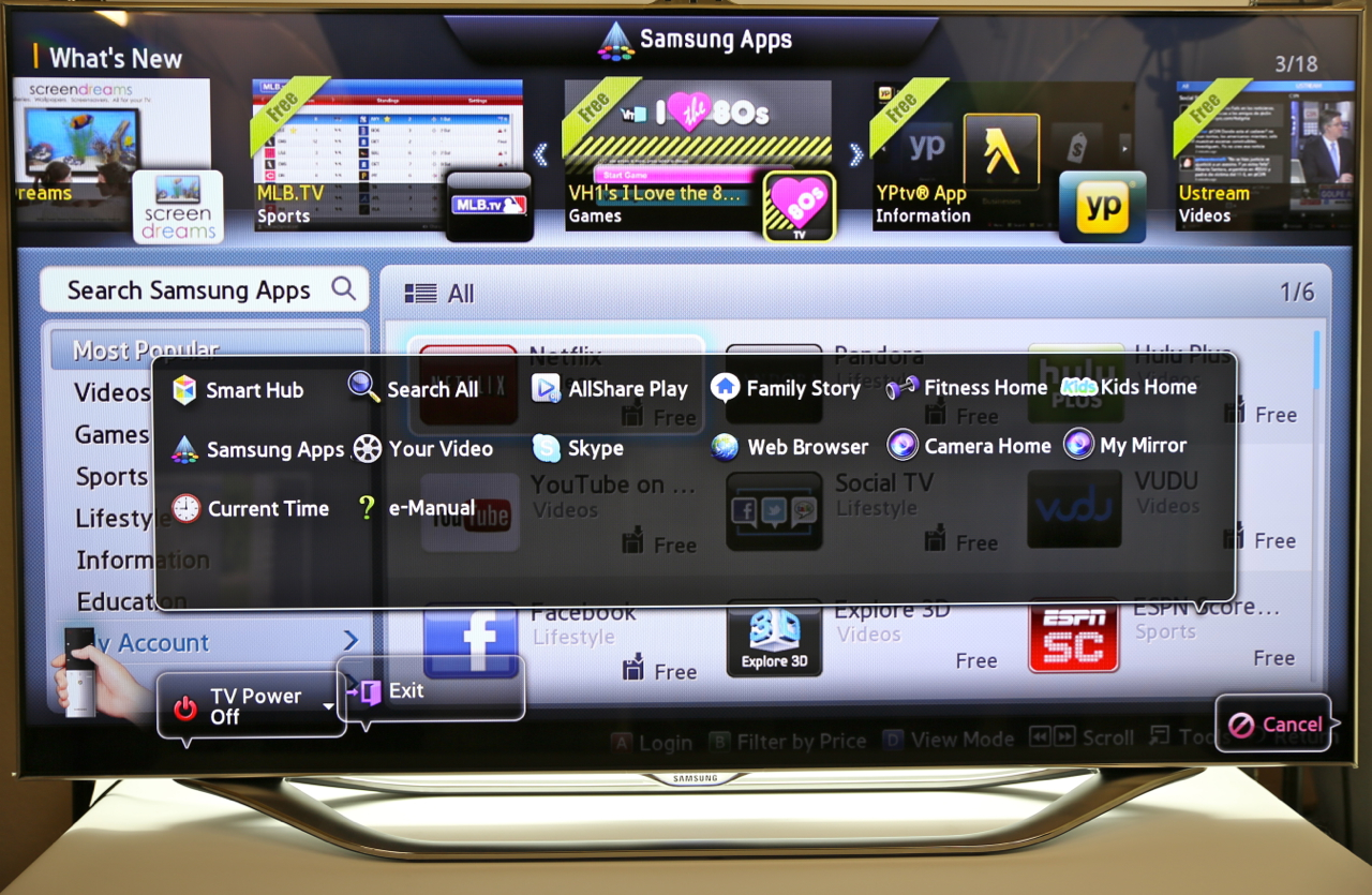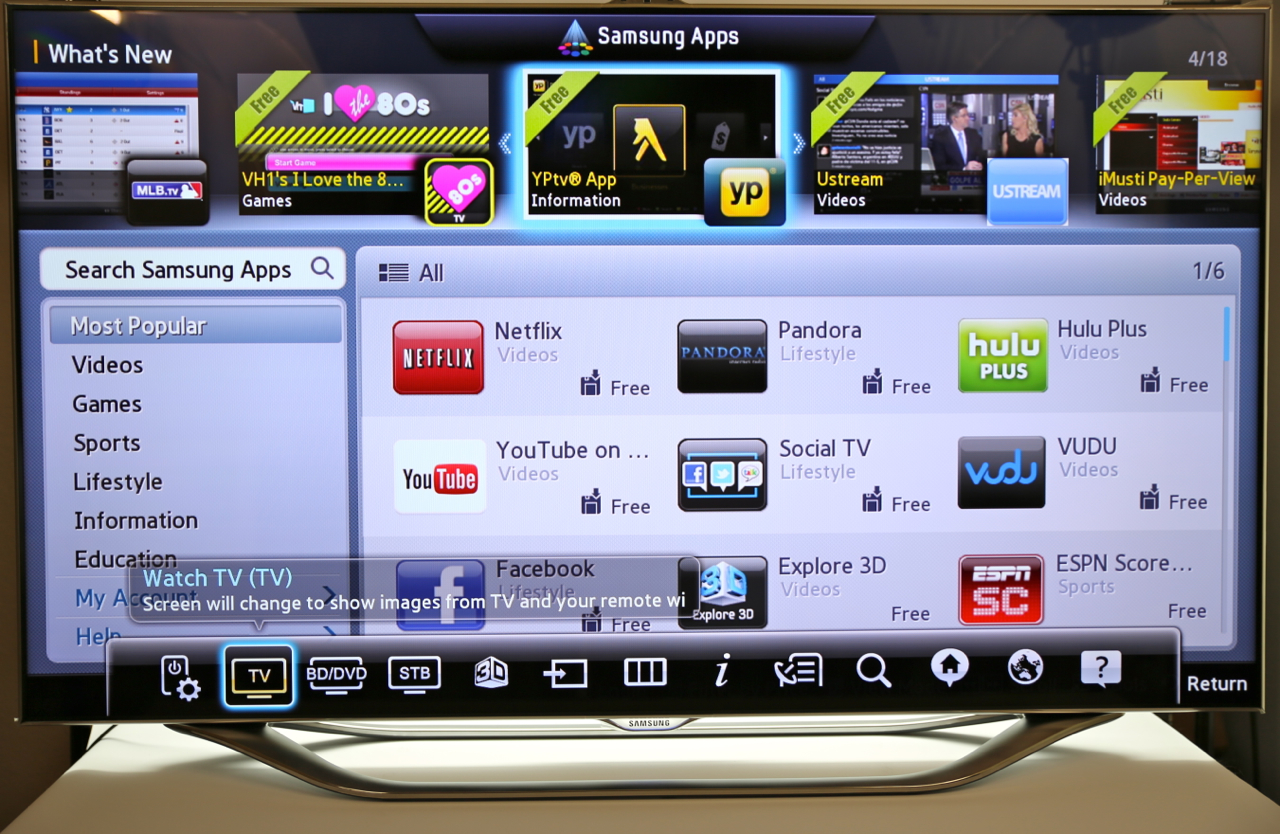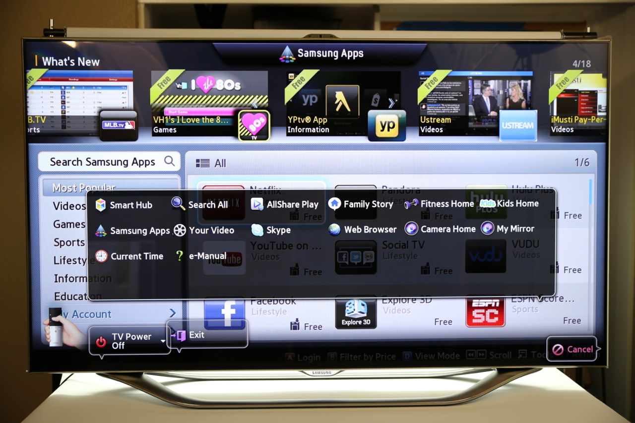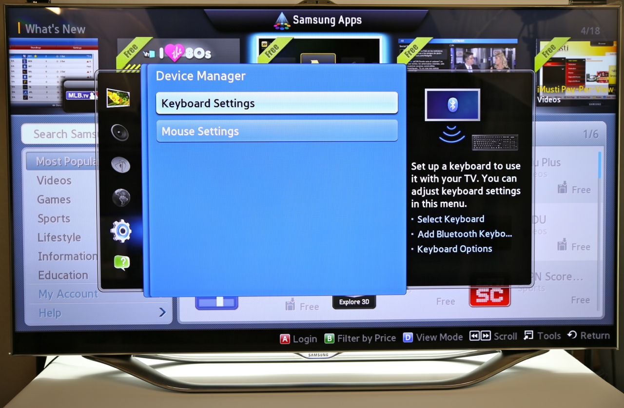 Voice commands are nothing without accuracy, and Samsung's system does a surprisingly solid job of recognizing and interpreting. Part of that is by shifting the microphone from the TV itself to the remote control, something likely to be closer to the user. Samsung's system recognizes addresses and commands like "Power On" to bring the set out of standby, though you still have to use the onscreen keyboard for URLs. Still, there's Bluetooth inside the set, and you can pair up any Bluetooth keyboard you might have – we tried an Apple keyboard, and it worked with no problems.