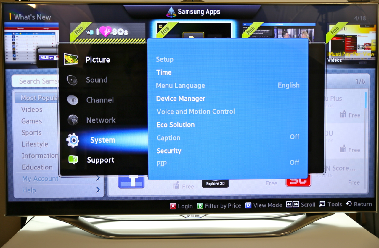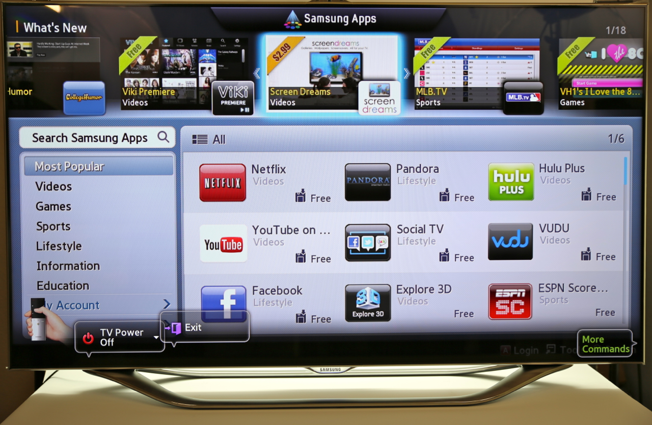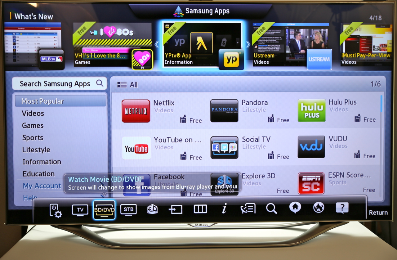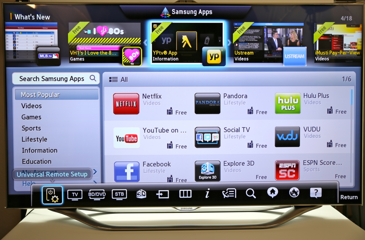 Voice commands are nothing without accuracy, and Samsung's system does a surprisingly solid job of recognizing and interpreting. Part of that is by shifting the microphone from the TV itself to the remote control, something likely to be closer to the user. Samsung's system recognizes addresses and commands like "Power On" to bring the set out of standby, though you still have to use the onscreen keyboard for URLs. Still, there's Bluetooth inside the set, and you can pair up any Bluetooth keyboard you might have – we tried an Apple keyboard, and it worked with no problems.