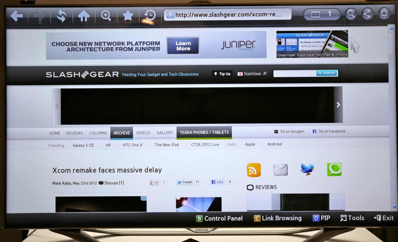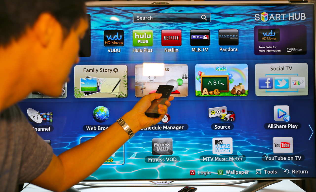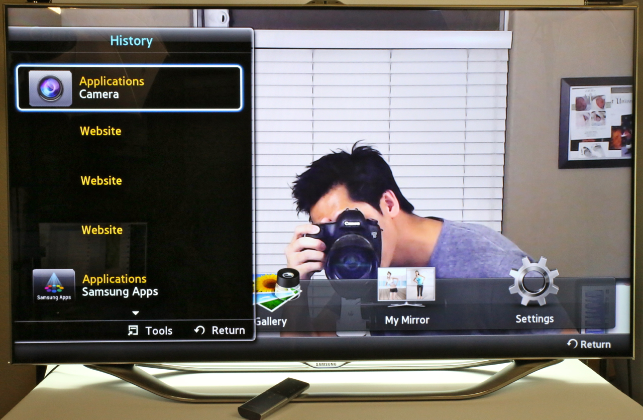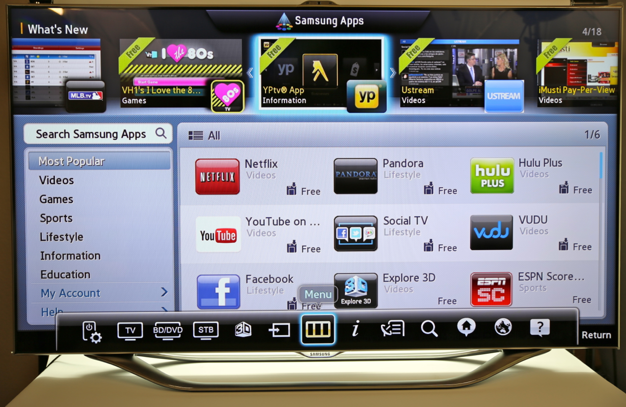 Voice commands are nothing without accuracy, and Samsung's system does a surprisingly solid job of recognizing and interpreting. Part of that is by shifting the microphone from the TV itself to the remote control, something likely to be closer to the user. Samsung's system recognizes addresses and commands like "Power On" to bring the set out of standby, though you still have to use the onscreen keyboard for URLs. Still, there's Bluetooth inside the set, and you can pair up any Bluetooth keyboard you might have – we tried an Apple keyboard, and it worked with no problems.