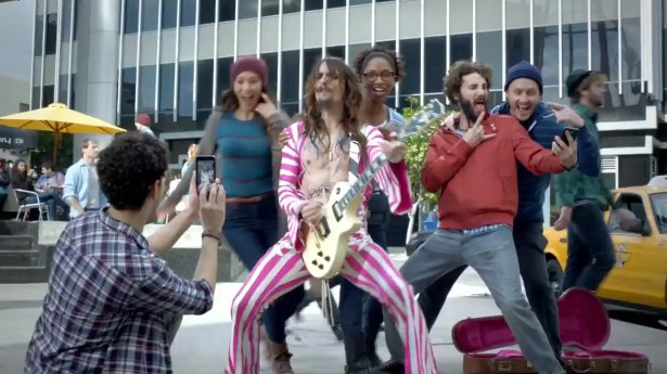 For its Super Bowl ad, Samsung didn't depart too much from its existing script. Set to "I Believe in a Thing Called Love" by The Darkness, it features band lead Justin Hawkins in a candy-cane catsuit, Australian supermodel Miranda Kerr, football star Brian Urlacher and pro skateboarder Paul Rodriguez.