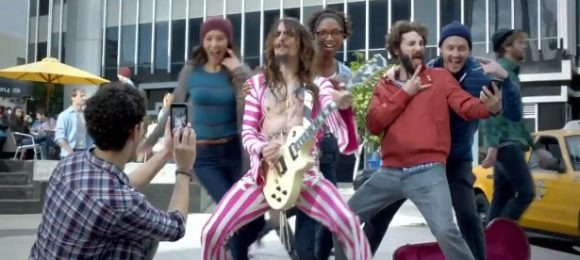 For its Super Bowl ad, Samsung didn't depart too much from its existing script. Set to "I Believe in a Thing Called Love" by The Darkness, it features band lead Justin Hawkins in a candy-cane catsuit, Australian supermodel Miranda Kerr, football star Brian Urlacher and pro skateboarder Paul Rodriguez.