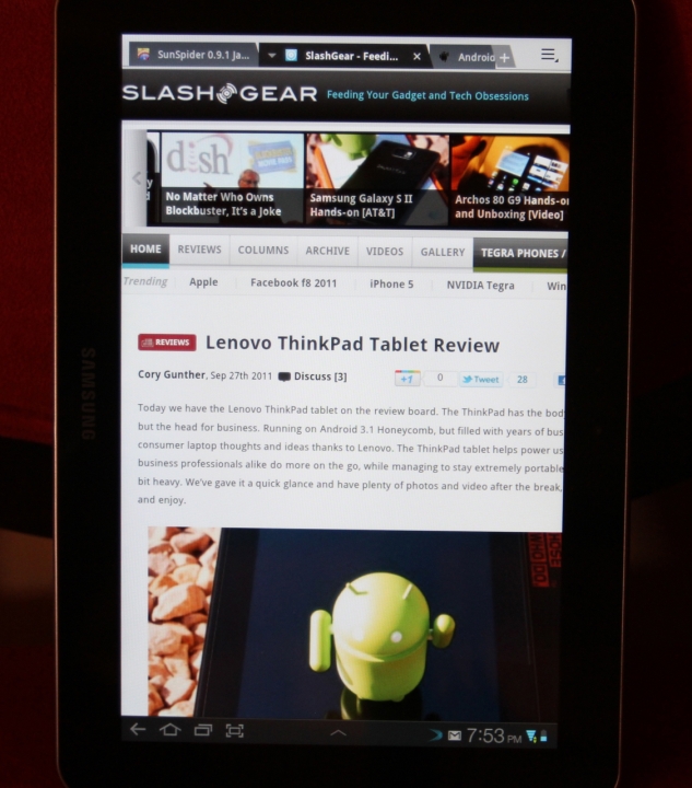 Performance from the 1GHz dual-core Tegra 2 processor isn't anything we haven't seen before, but Android 3.1 runs along at a brisk pace just as you'd hope. We'll be benchmarking and doing battery testing in time for the full MMtech Online review. Samsung has been going for "bigger is better" in its smartphones, screen sizes gradually increasing with each generation; could the reverse be true for its tablet line-up?