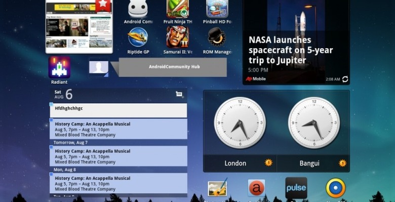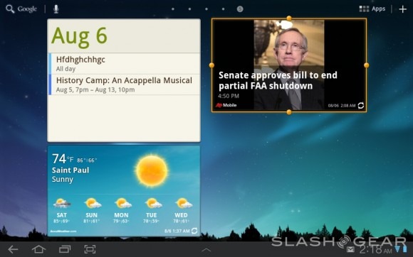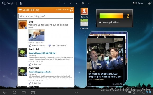 First up is Samsung's new approach to widgets. What they've done here is spruce up the grid system Google's made with Android Honeycomb with some widgets that fit together like a magazine. You'll have the option to change the size of several of these widgets of course, thanks to Android 3.1, and in at least one case, that being with the Gallery widget, you're able to turn your whole home screen into one gigantic picture flipping pretty panel.
