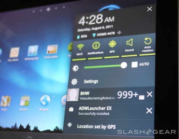 When you tap the lower right-hand corner of your display in Honeycomb, you get a panel that shows you the time, date, battery level, Wi-Fi signal, screen brightness, has a link to settings, and shows your updates. What Samsung has done is to take this already working system and add some well-done functionality to it. You've now got a set of switches that activate or de-activate GPS, Wi-Fi, Notifications, Airplane Mode and more with a simple swipe and a tap or just a tap. This bit of TouchWiz UX is certainly an improvement over the slightly less-accessible panel provided by the stock version of Honeycomb.