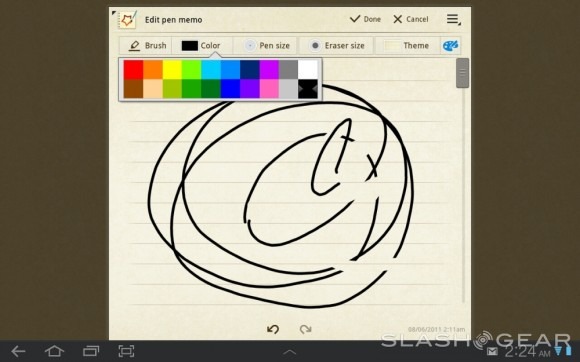This app is what many in the forums are calling a stripped down version of Evernote, this note taking system able to collect your thoughts simply with text and fingers for pen or paint. You'll be able to keep everything in your day straight here in this yellow paper with lines and multi-color paint strips. You'll see this Pen Memo pop up in your Mini Apps Tray as well in a compact version – this is the one you'll end up using most.