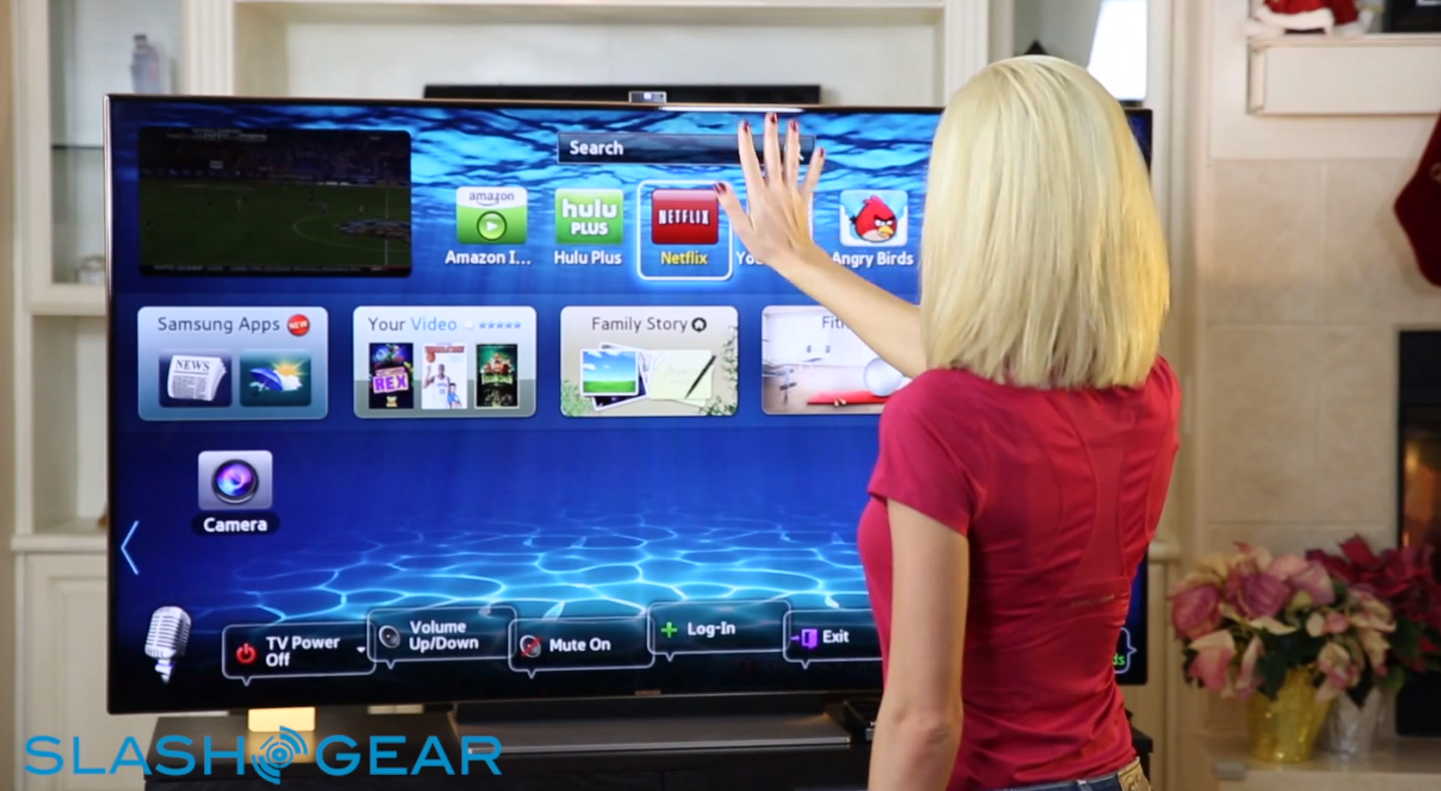 Voice control isn't the only navigation option. The camera on the top of the ES9000 can track gestures, like previous high-end Samsung smart TVs, first learning to recognize the slow movements of an outstretched palm side to side, and then allowing you to swipe around the UI, "grab" icons and controls to activate them, and point to letters on an onscreen keyboard. It's not quite Kinect, but it works neatly with casual games like Angry Birds, and handled differentiating between multiple viewers (only one of which was controlling at any one time) well.
