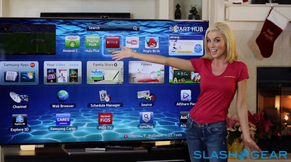 Voice control isn't the only navigation option. The camera on the top of the ES9000 can track gestures, like previous high-end Samsung smart TVs, first learning to recognize the slow movements of an outstretched palm side to side, and then allowing you to swipe around the UI, "grab" icons and controls to activate them, and point to letters on an onscreen keyboard. It's not quite Kinect, but it works neatly with casual games like Angry Birds, and handled differentiating between multiple viewers (only one of which was controlling at any one time) well.