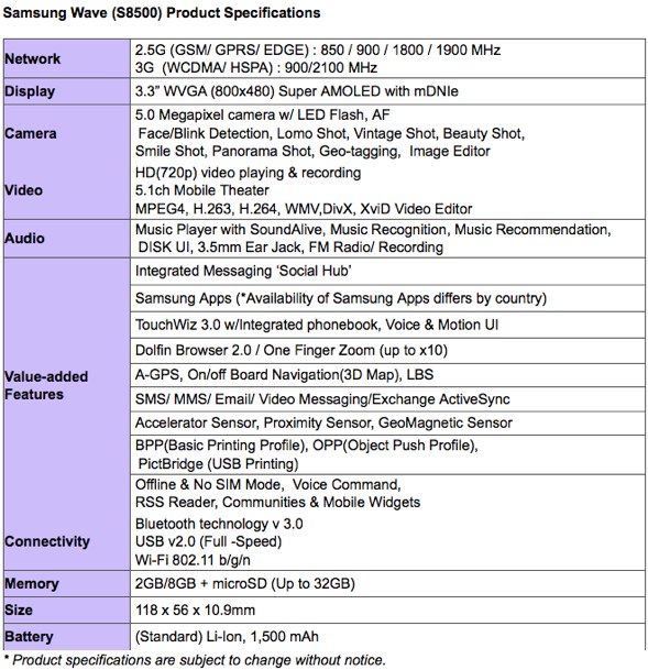 February 14th, 2010, Barcelona, Spain – Samsung Electronics Co. Ltd., a leading mobile phone provider, today announced the launch of the Samsung Wave (Model: S8500). This is the first mobile handset to be released on Samsung's new, open mobile platform, Samsung bada, and the cornerstone of the company's commitment to provide a smartphone for every lifestyle.