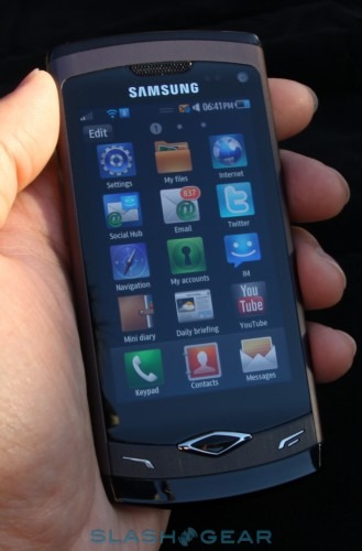 In terms of hardware, there's plenty to like about the Wave S8500. Measuring a slender 10.9mm thick, the fascia is taken up by a 3.3-inch WVGA Super AMOLED display, brighter than regular AMOLED, while there's a 5-megapixel camera with LED flash and autofocus, 720p HD video recording, WiFi b/g/n and Bluetooth 3.0. Otherwise it's the usual mixture of dualband (900/2100MHz) HSPA, quadband GSM/EDGE, a microSD card slot (augmenting 2GB or 8GB of internal storage, SKU depending), A-GPS and a 3.5mm headphone socket. Keeping things running is Samsung's own 1GHz Hummingbird processor, and the whole thing feels high-quality with a metallic chassis that's certainly more smartphone than it is feature-phone.