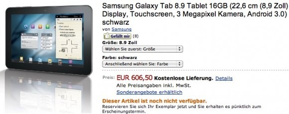 Samsung's Galaxy Tab 8.9 isn't expected to hit the market until sometime this summer, but we're gradually piecing together the pricing for the 8.9-inch slate. Amazon Germany has thrown the tablet up for pre-order at €606.50 ($853), a considerable premium above the $469 we know Samsung will be charging in the US.