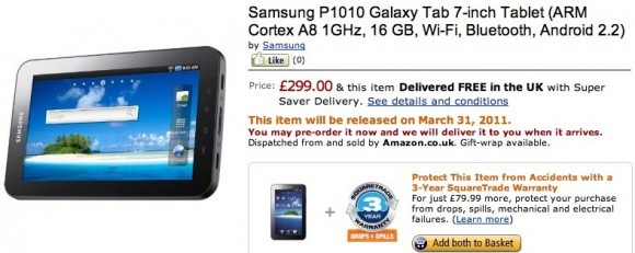 The Samsung Galaxy Tab P1010 – the WiFi-only version of Samsung's 7-inch Android 2.2 tablet – has gone up for pre-order at Amazon UK, complete with an estimated ship date of March 31. Priced at £299 ($477), or £100 less than the unlocked 3G-equipped P1000, the new version has the same 1024 x 600 touchscreen, WiFi, single-core 1GHz processor and 16GB of storage.