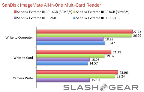 On card-to-computer and computer-to-card performance tests, we transferred and clocked the time taken to write to the card from the computer via the SanDisk ImageMate and vice versa. A folder of 68 Raw images from the 5D Mark II, each shot with an average size of 22MB, amounted to 1.5GB to transfer. The speed of the reader is also dependent on the components inside your computer. The read performance above was achieved with a newer P45 logic board with 1TB of Western Digital Black Caviar storage; we saw rates of only half those speeds when we switched to an older, Santa Rosa based MacBook Pro with a 5400RPM drive.