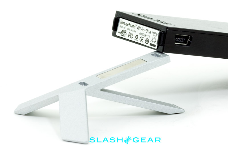 The newest SanDisk ImageMate All-in-one reader has a unique magnetic base to offer vertical placement when used with the supplied metal tripod stand. The stand itself has a rubber base to prevent scratching that precious bird-eye inlay workstation of yours, and fits comfortably but does show a tendency to come loose easily. We also found that the metal plate peeled off after just a few uses; frankly, it's not the best magnetic fixture design we've seen, but it does offer instant portability on-the-go. The chassis is shiny black plastic and has a very thin profile for a multi-card reader; there's just enough room to squeeze in the blue LED light used to indicate transfer activity. It works with all popular memory card types, with a claimed top speed of up to 34MB/s when used with SanDisk's own Extreme IV 45MB/s CompactFlash.