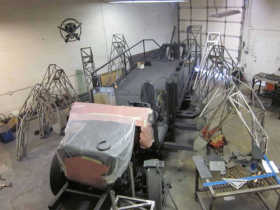 Another hydraulic system makes the entire vehicle lift off the ground. The entire works is covered in sculpted metal sheathing and steam punk style rivets. A multicolor light show makes key points on the vehicle glow for cool effect at night. The designer and builder of the vehicle is Kirk Jellum, and aerospace engineer that worked on the James Webb Space telescope.