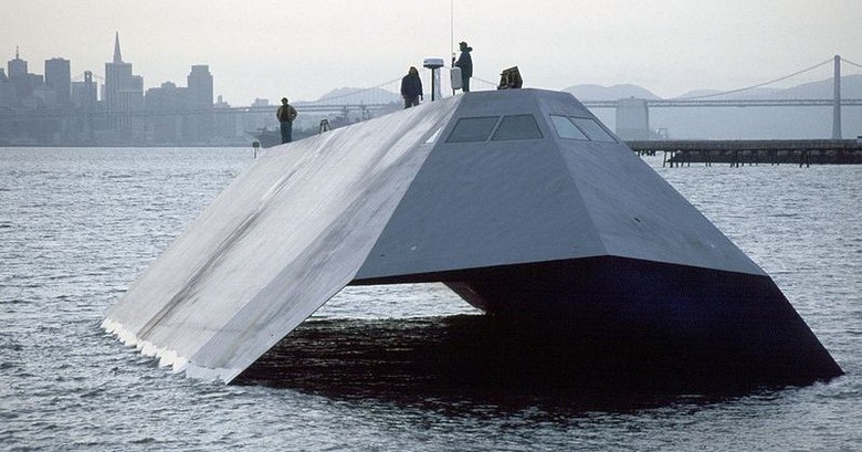 Built by Lockheed Martin, Sea Shadow borrowed stealth technologies from radar-avoiding planes such as the F-117 Nighthawk, including various absorbent materials and steeply-bowed sides that scatter radar signals. A catamaran, it has a propeller, aft stabilizer and inboard hydrofoil at the end of each strut, with crew space for twelve inside. Although never – as far as publicly known – equipped with live weaponry, the concept was that such a ship could covertly approach enemy ships and territory and gain a great tactical advantage.