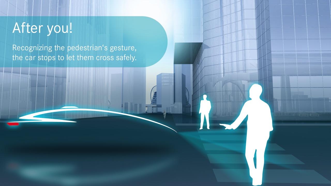 Although self-driving vehicle research has so far focused on replacing the person behind the steering wheel, equally important is how it replaces the verbal and non-verbal methods of communication between driver and those around, Mercedes argues. For instance, drivers often "wave" pedestrians over the road, while people waiting to be picked up point to a space near the sidewalk where they want the car to pull over.