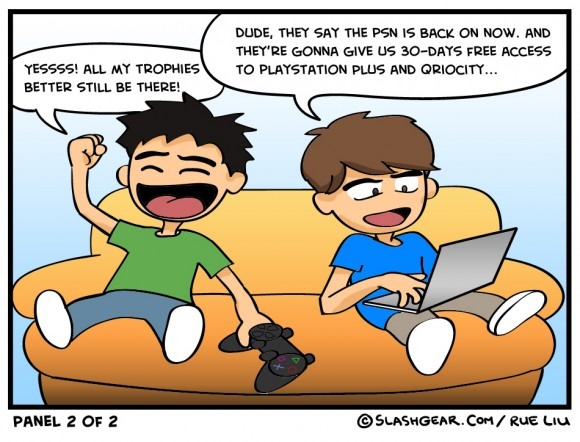 The PlayStation Network outage looks to be resolved soon with the latest response from Sony stating that services will start coming back this week. Many PSN subscribers were upset with the situation, both frustrated at Sony's delay in response and at the hackers responsible. However, many couldn't help but aim their anger at Sony, with reports claiming 1 out of 5 would switch to the Xbox. Nonetheless, will Sony's response be enough for PSN subscribers and will they be able to regain trust? For both panels of this week's comic, continue after the cut.