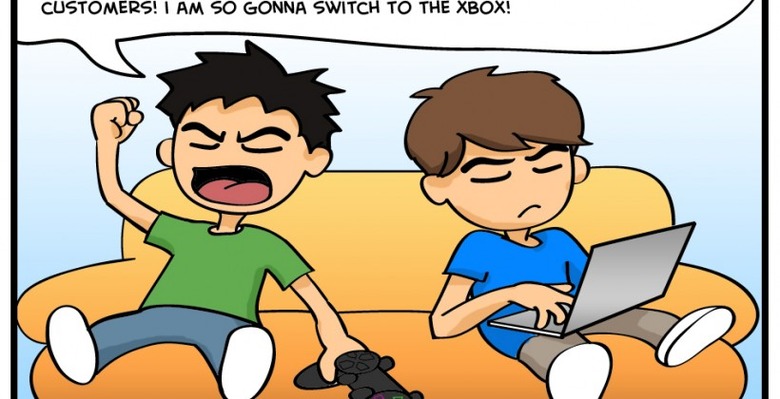 The PlayStation Network outage looks to be resolved soon with the latest response from Sony stating that services will start coming back this week. Many PSN subscribers were upset with the situation, both frustrated at Sony's delay in response and at the hackers responsible. However, many couldn't help but aim their anger at Sony, with reports claiming 1 out of 5 would switch to the Xbox. Nonetheless, will Sony's response be enough for PSN subscribers and will they be able to regain trust? For both panels of this week's comic, continue after the cut.
