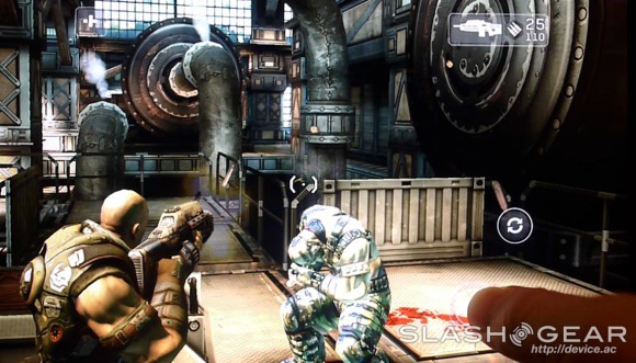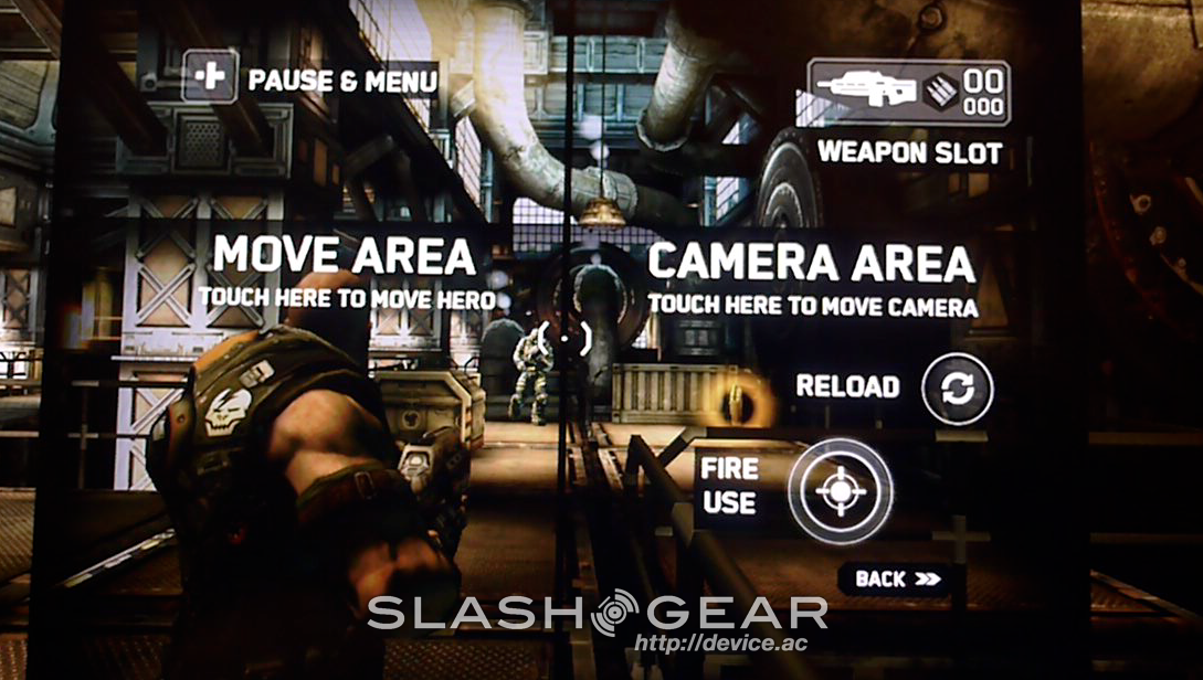 This game sits you behind your main hero with you at an over-the-shoulder perspective, just far enough away to see the guns flogging the enemy in full HD. Pieces of the environment may well be falling away while you crouch behind them, enemies may well be 10 times the size of your own character's body, and you might well find this to be one of the more difficult games you've ever played on Android, especially if you're used to only console controllers.