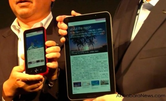 The two prototypes had a 5.5-inch and 10.8-inch display respectively, complete with touchscreen interfaces. They'll use the XMDF format, already popular in Japan, which pulls together text, A/V content and more into something that can be read on cellphones, set-top boxes and tablet-style ereaders like these.