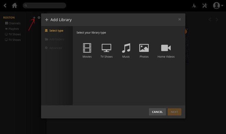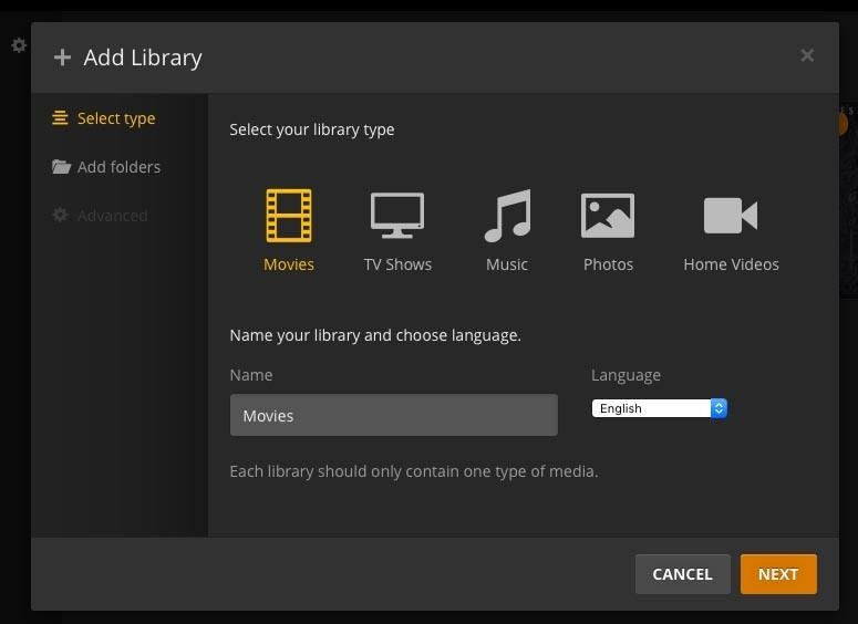 Click the "+" sign shown in the screenshot above. You'll be presented with the "Add Library" window where you'll first select which type of content you're adding. If you're adding a movie library to the server, obviously you'll want to select "Movies." The same goes with other types of content. You'll need to make sure your content is organized, with each library having only one category. Your 'Movies' library, for example, shouldn't have music mixed in.