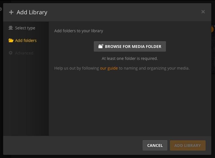 Choose a name for the library (this is how it will appear in Plex later on), then click "Next" and "Browse for Media Folder." Choose the folder in which all of your movies (or whatever content type) are located. If the content is on an external drive, you'll need to plug that in before this step.
