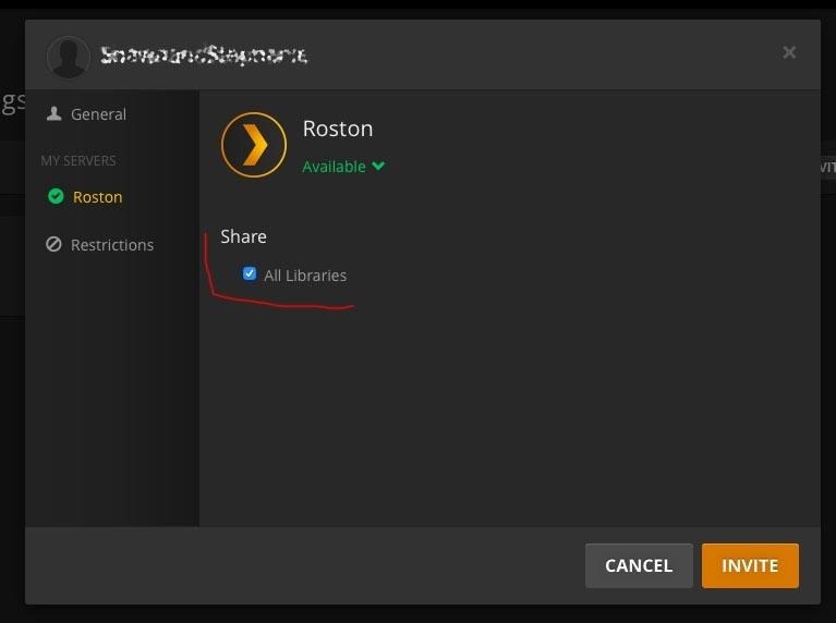 Type the email address they used for their Plex account and locate the friend. You'll be immediately prompted to choose what you're willing to share with this new friend. Unless you have something specific you want to restrict, simply click "All libraries," then send the invitation.