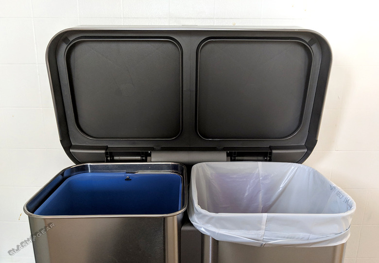 The can is 18.5 x 13 x 24.8 inches – that's 24.8-inches tall, 13-inches from back to front, and 18.5-inches wide. When the can is open, the distance from base to tip of can top is 34.6-inches. The capacity of this can is 58 liters, and it's split into two sections.